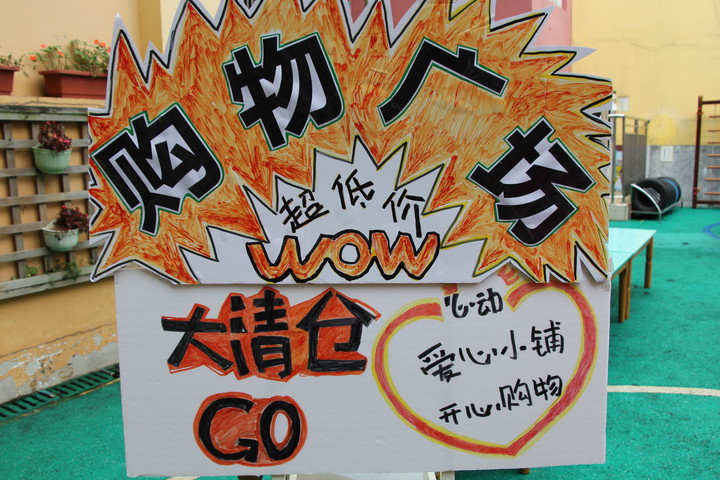 在義賣現(xiàn)場(chǎng),大家都精心設(shè)計(jì)了漂亮的招牌、宣傳廣告,豐富多彩的廣告標(biāo)語為今天的義賣增添了不色彩。看我們的小朋友們,坐在自己班的攤位前,家長(zhǎng)們也在一旁協(xié)助著,想出各色各樣的口號(hào)來吸引其他小顧客們的注意。孩子們紛紛扮演起小“老板”的角色,熱情的向往來的小“顧客”推銷自己的商品。