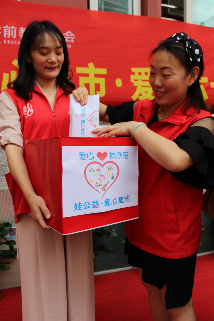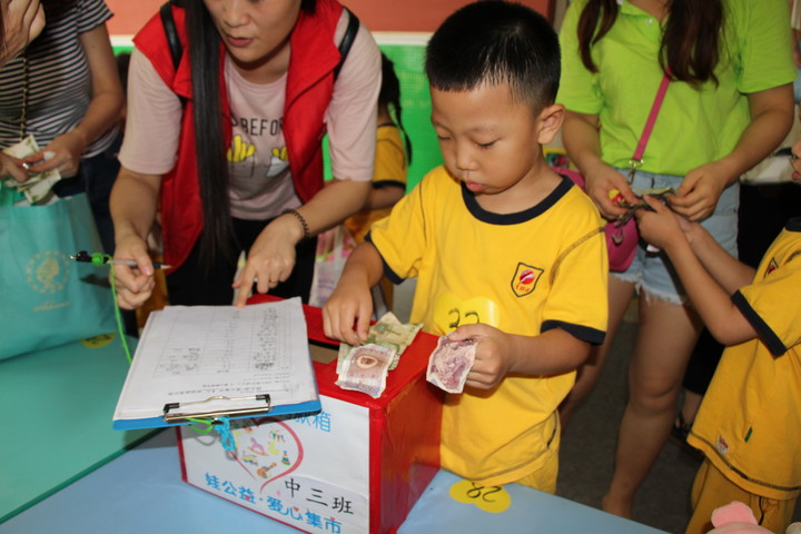 義賣活動(dòng)結(jié)束后小朋友和家長(zhǎng)共同把義賣得到的錢投入到募捐箱內(nèi),并由行政老師清點(diǎn)捐款。