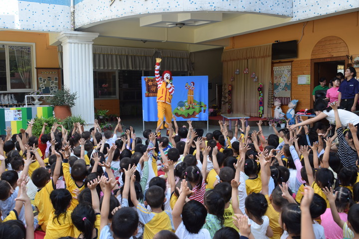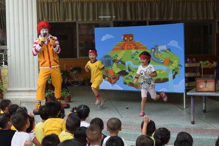 隨著一陣歡呼聲,麥當勞叔叔出場了!可愛的裝扮馬上吸引了孩子的眼球,孩子們激動地站起來歡呼,麥當勞叔叔用他那詼諧的語言、夸張的動作打招呼,現(xiàn)場氣氛立刻活躍起來了。隨后麥當勞叔叔把孩子帶進了闖關尋寶的游戲中,通過知識問答、即興表演、跑步比賽等等環(huán)節(jié),讓孩子在快樂游戲中歷經(jīng)考驗,闖關得勝,最后尋到寶藏,獲得精美禮物。