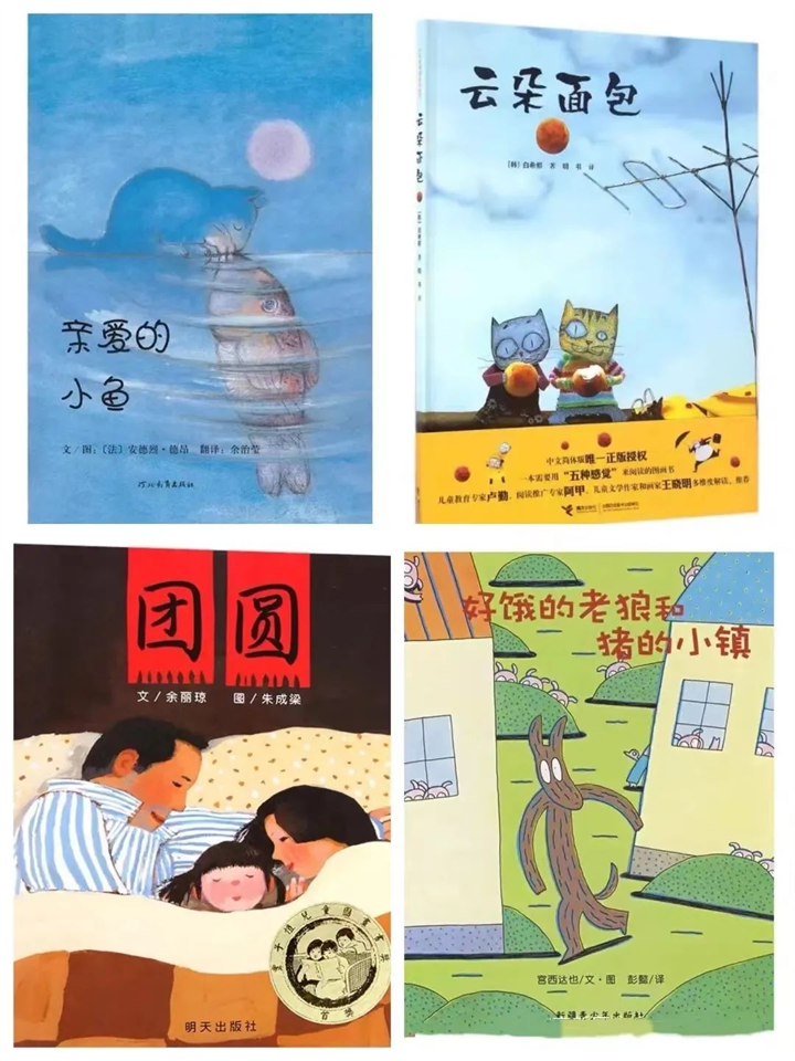 《親愛的小魚》《棕熊的神奇事》《團(tuán)圓》《好餓的老狼和豬的小鎮(zhèn)》《長頸鹿不會跳舞》《搬過來、搬過去》《月亮的味道》《最奇妙的蛋》《獨(dú)一無二的魚》《沒有耳朵的兔子》《云朵面包》。