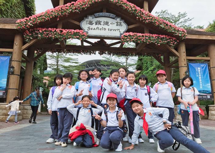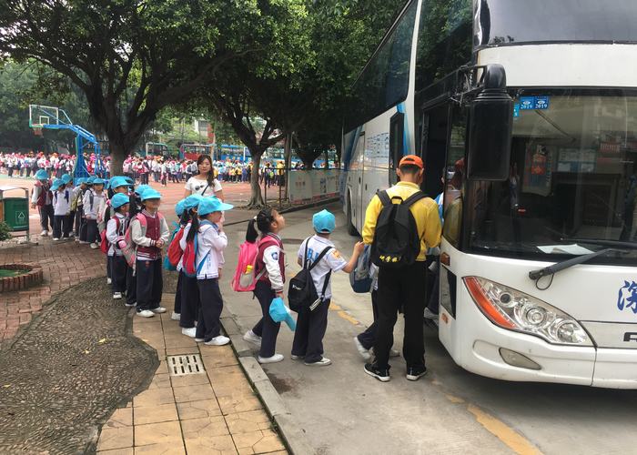 學(xué)生整齊排隊上車出發(fā)東部華僑城