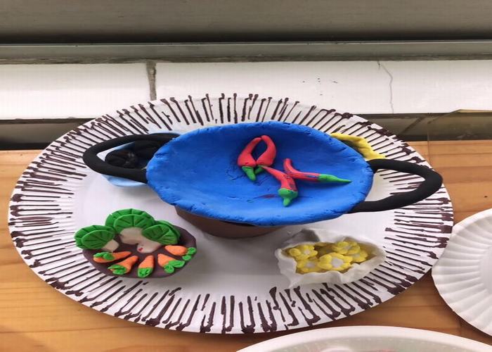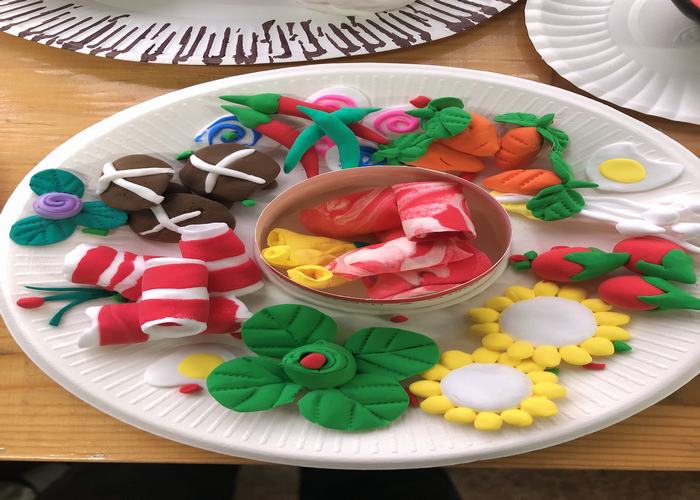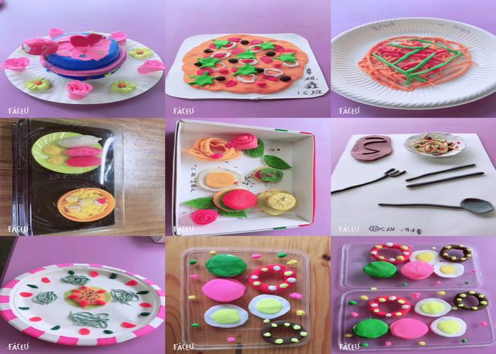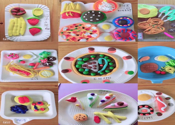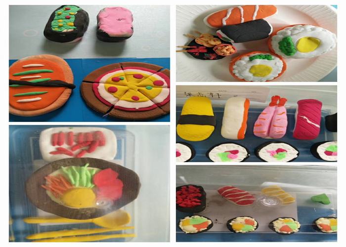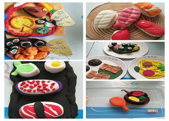 除了常規(guī)的書寫、繪畫、網(wǎng)絡(luò)搜索等學(xué)習(xí)活動(dòng),一年級的孩子們還根據(jù)各國飲食文化的不同,開展了“橡皮泥美食創(chuàng)意作品展”。