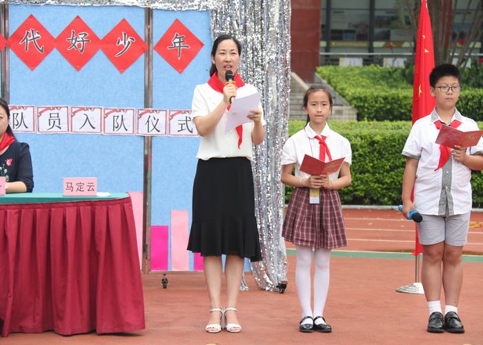 少先隊大隊輔導(dǎo)員馬定云老師在儀式中發(fā)表了講話。她在向新隊員表示祝賀的同時,激勵新老隊員用實際行動“踐行核心價值觀,爭做時代好隊員”。整齊響亮的“時刻準備著”的呼號表達了隊員們?yōu)榧t領(lǐng)巾增添光彩的決心、信心和恒心。